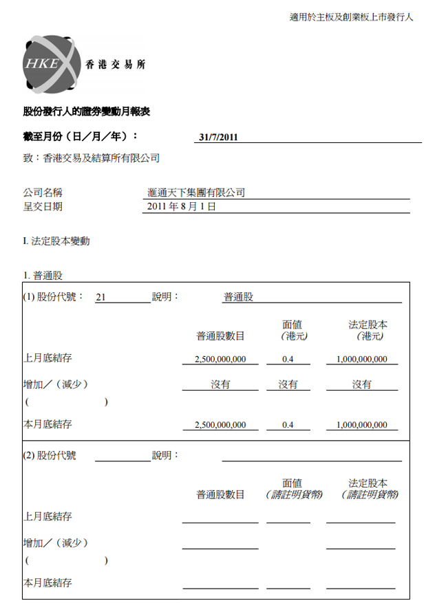 股份發行人的證券變動月報表31/7/2011